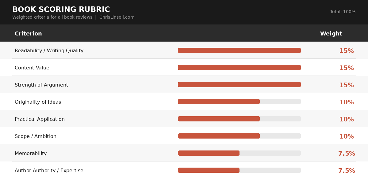 I score every book I review against a weighted rubric. The criteria stay consistent. The scores don't.